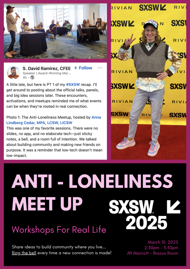 " The Anti-Loneliness Meetup, hosted by Anna Lindberg Cedar, MPA, LCSW, LICSW ... was one of my favorite sessions. There were no slides, no app, and no elaborate tech - just sticky notes, a bell,