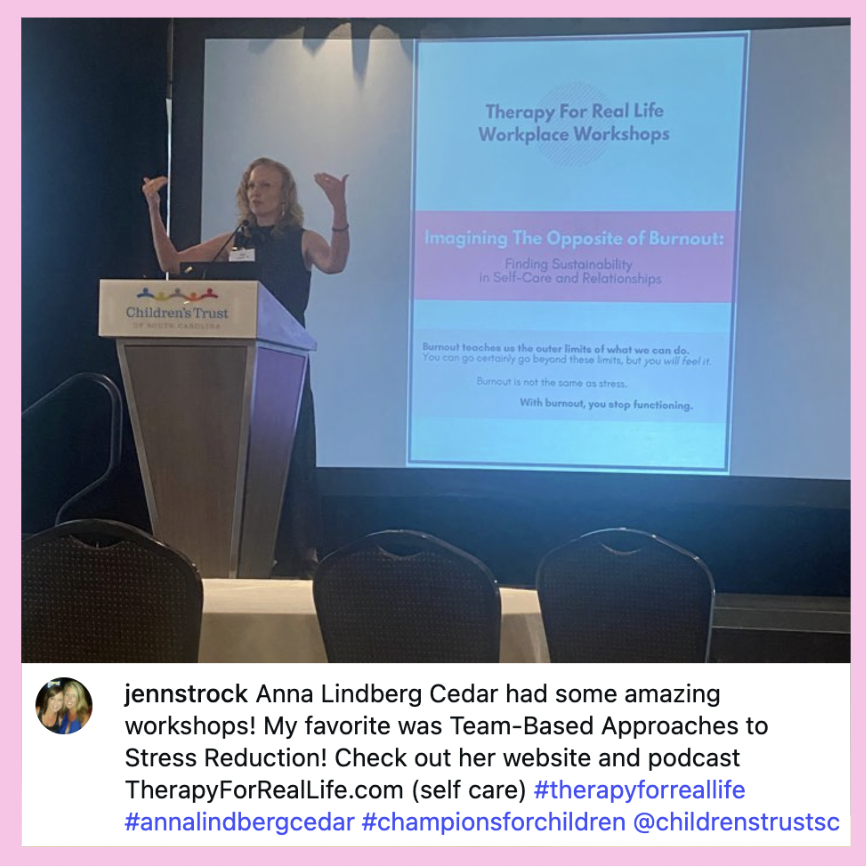 Workshops For Real Life hosted the initial keynote kickoff and a series of self-care workshops for hundreds of care workers at the Building Hope For Children Conference in South Carolina in 2022. Anna Lindberg Cedar, MPA, LCSW, LICSW spoke about self-care skills to tackle the overlapping epidemics of burnout and loneliness affecting our communities. One attendee, Jenn Strock, shares: